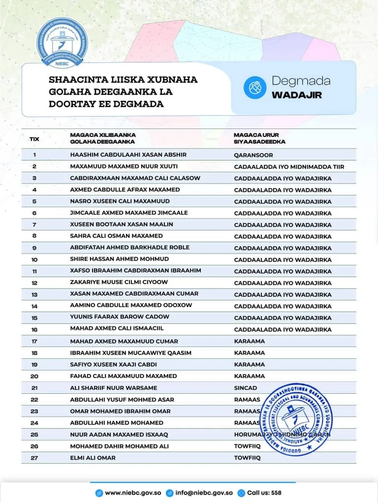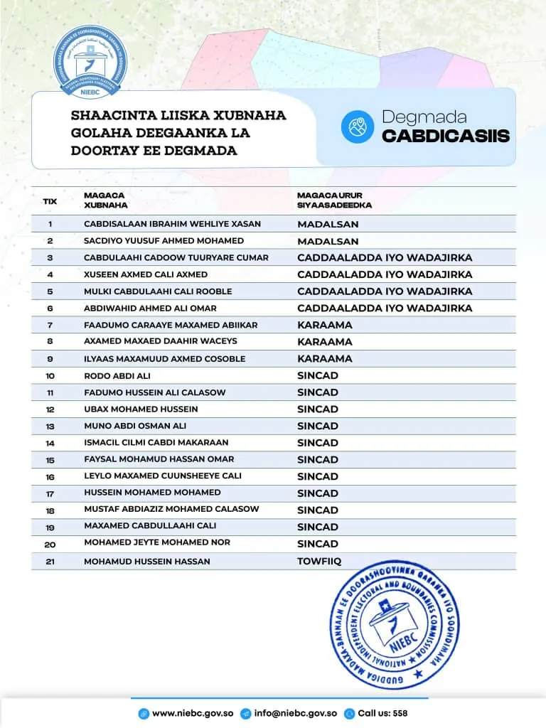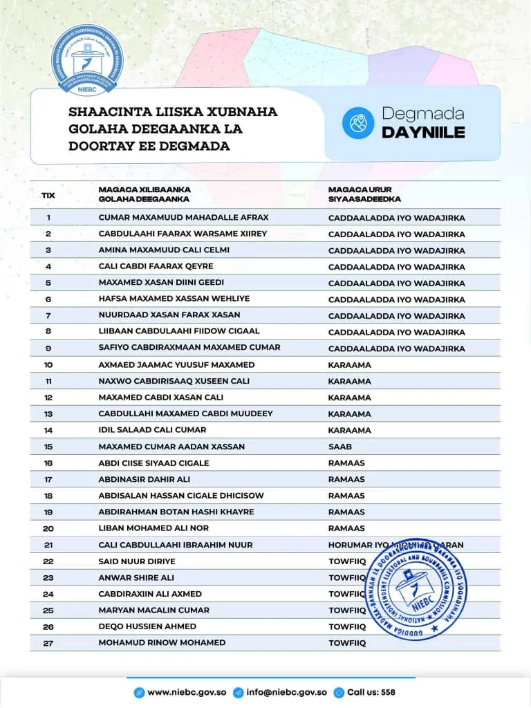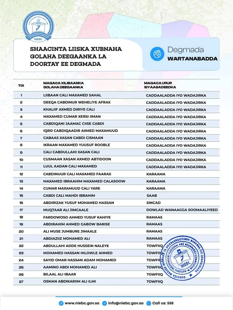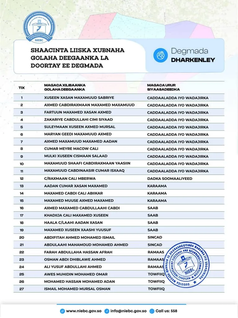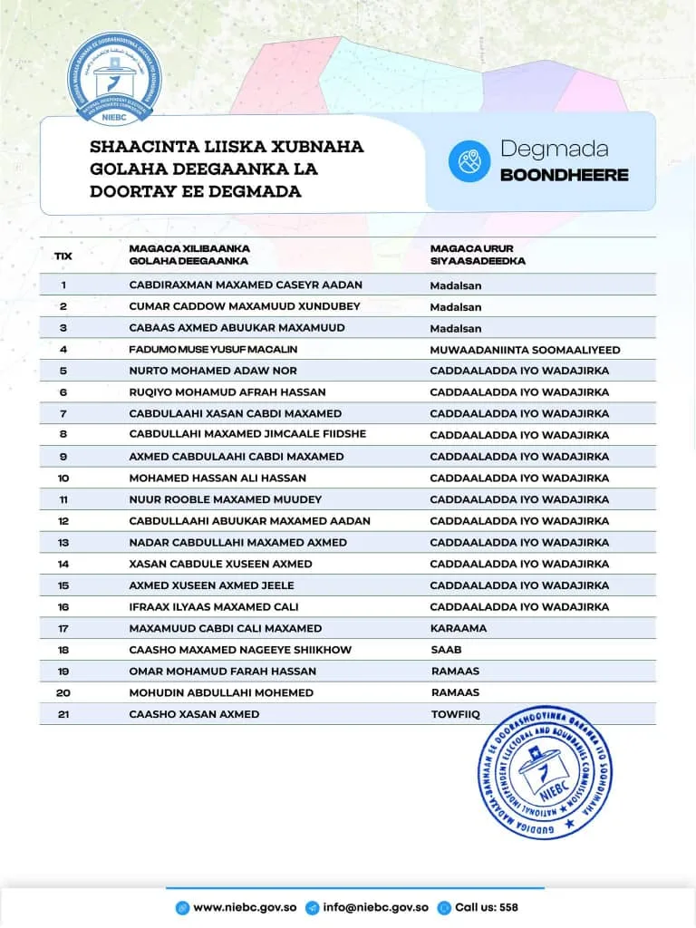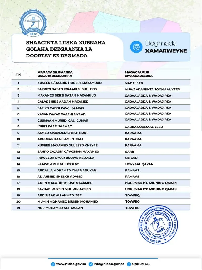 Waxaa halkan idin kula wadaagaynaa natiijada doorashada Golaha Deegaanka ee Degmooyinka Gobolka Banaadir, taas oo u dhacday sida hoos ku xusan: