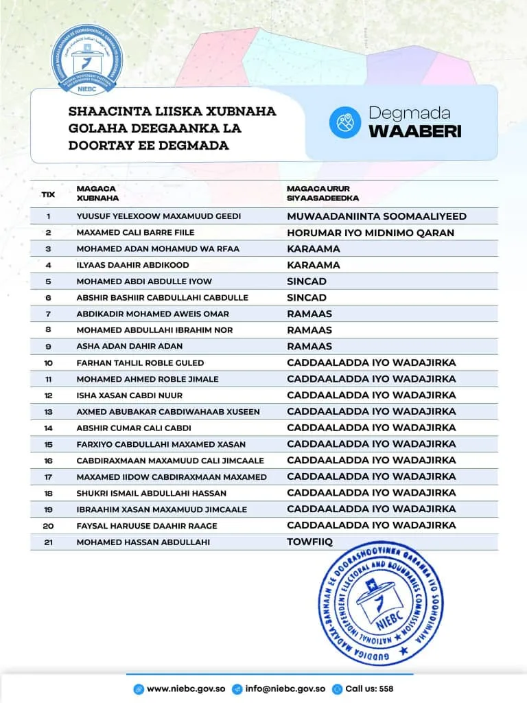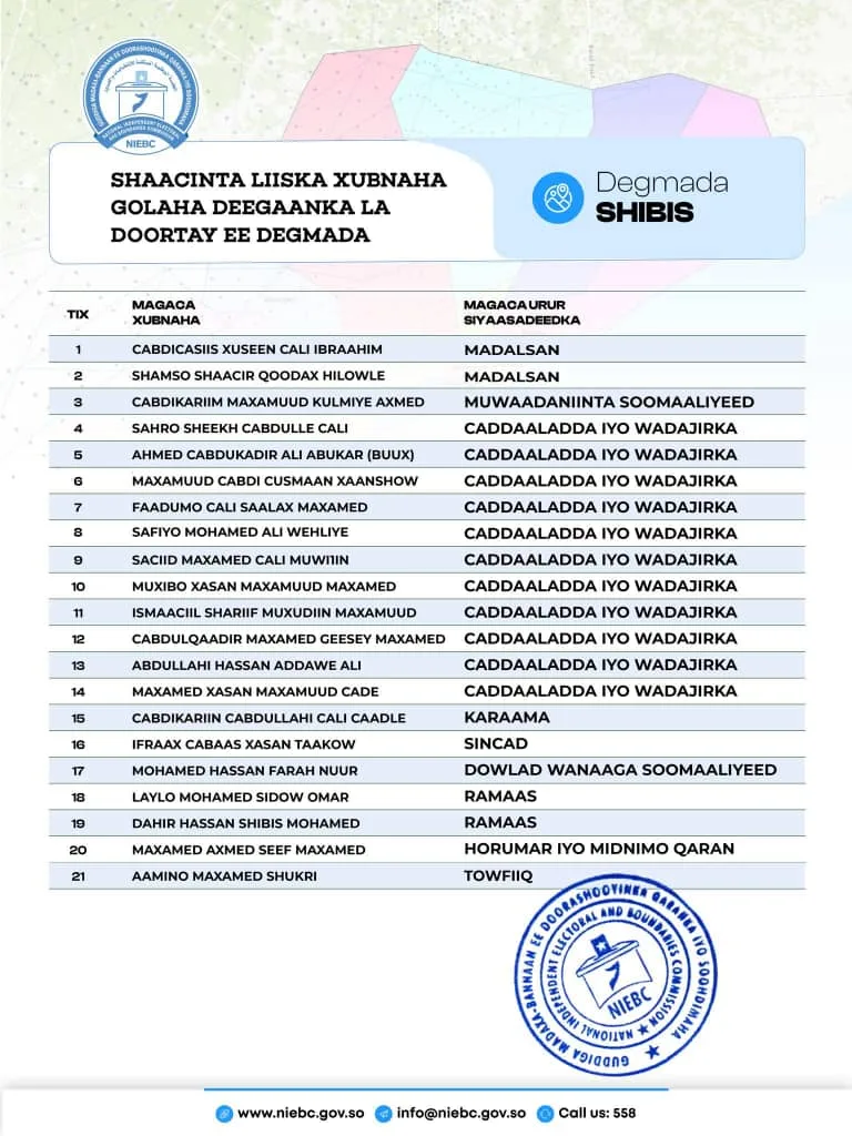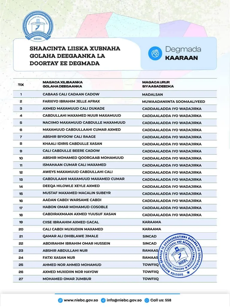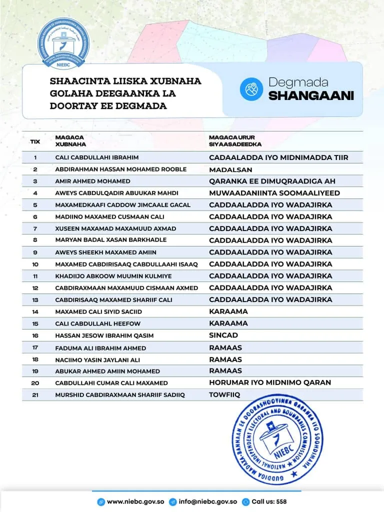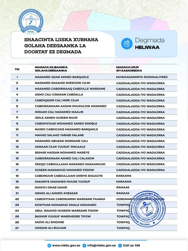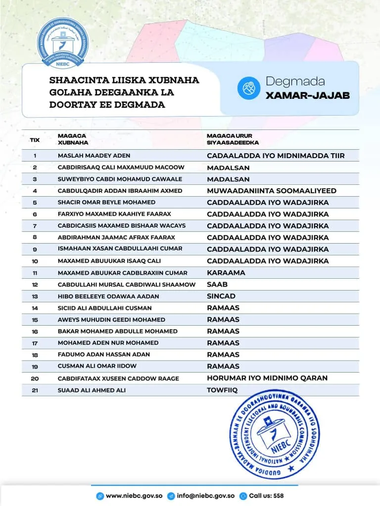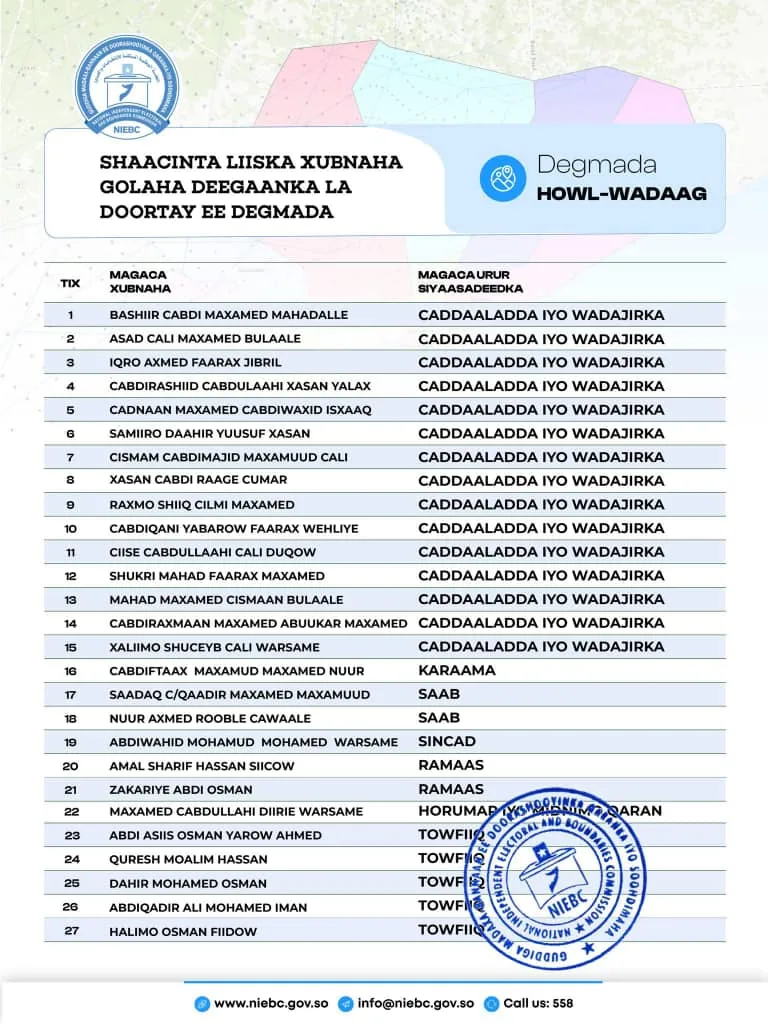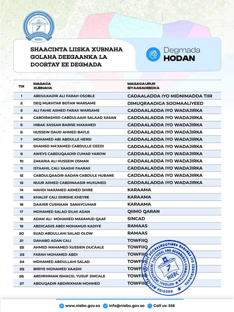 Waxaa halkan idin kula wadaagaynaa natiijada doorashada Golaha Deegaanka ee Degmooyinka Gobolka Banaadir, taas oo u dhacday sida hoos ku xusan: